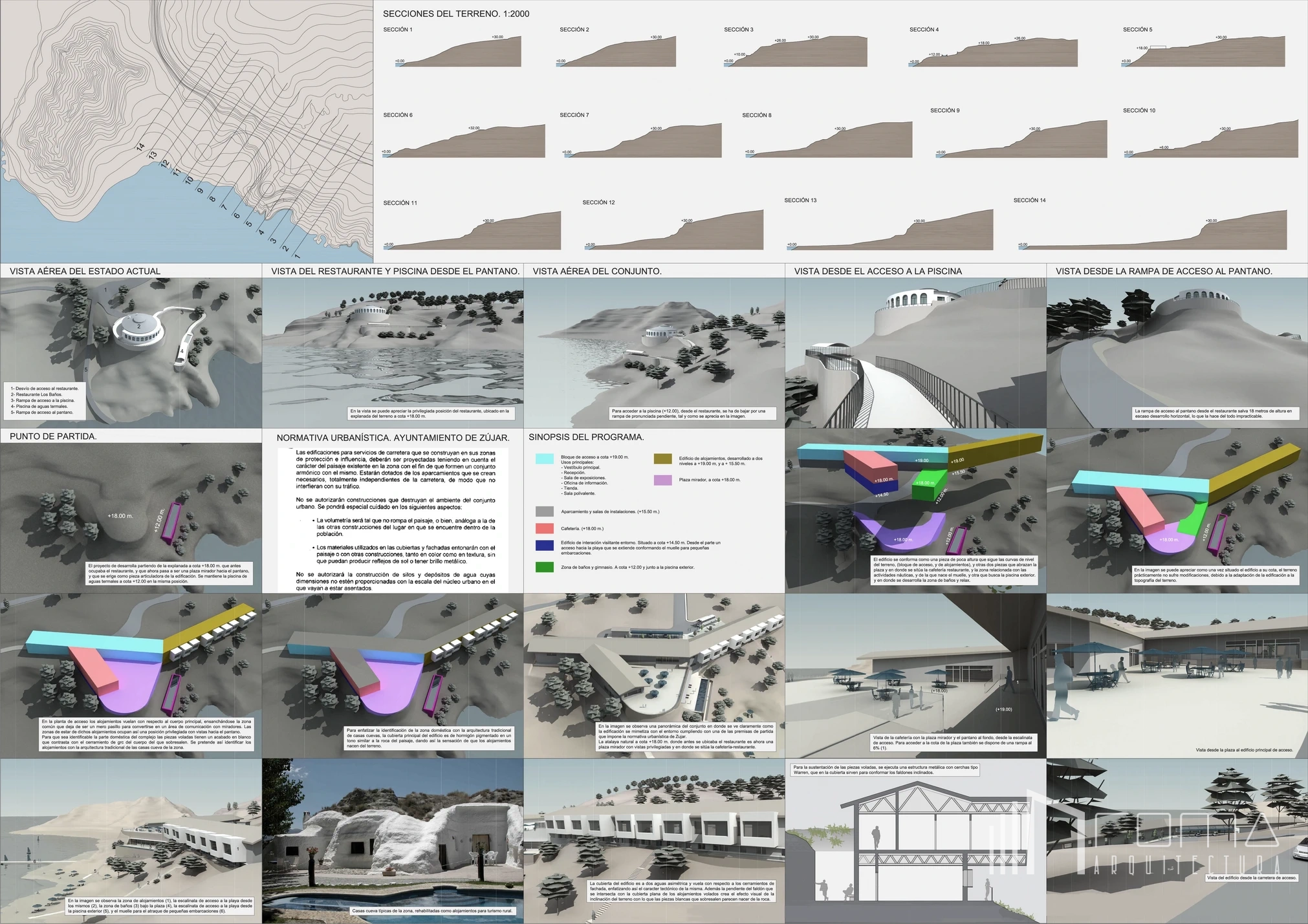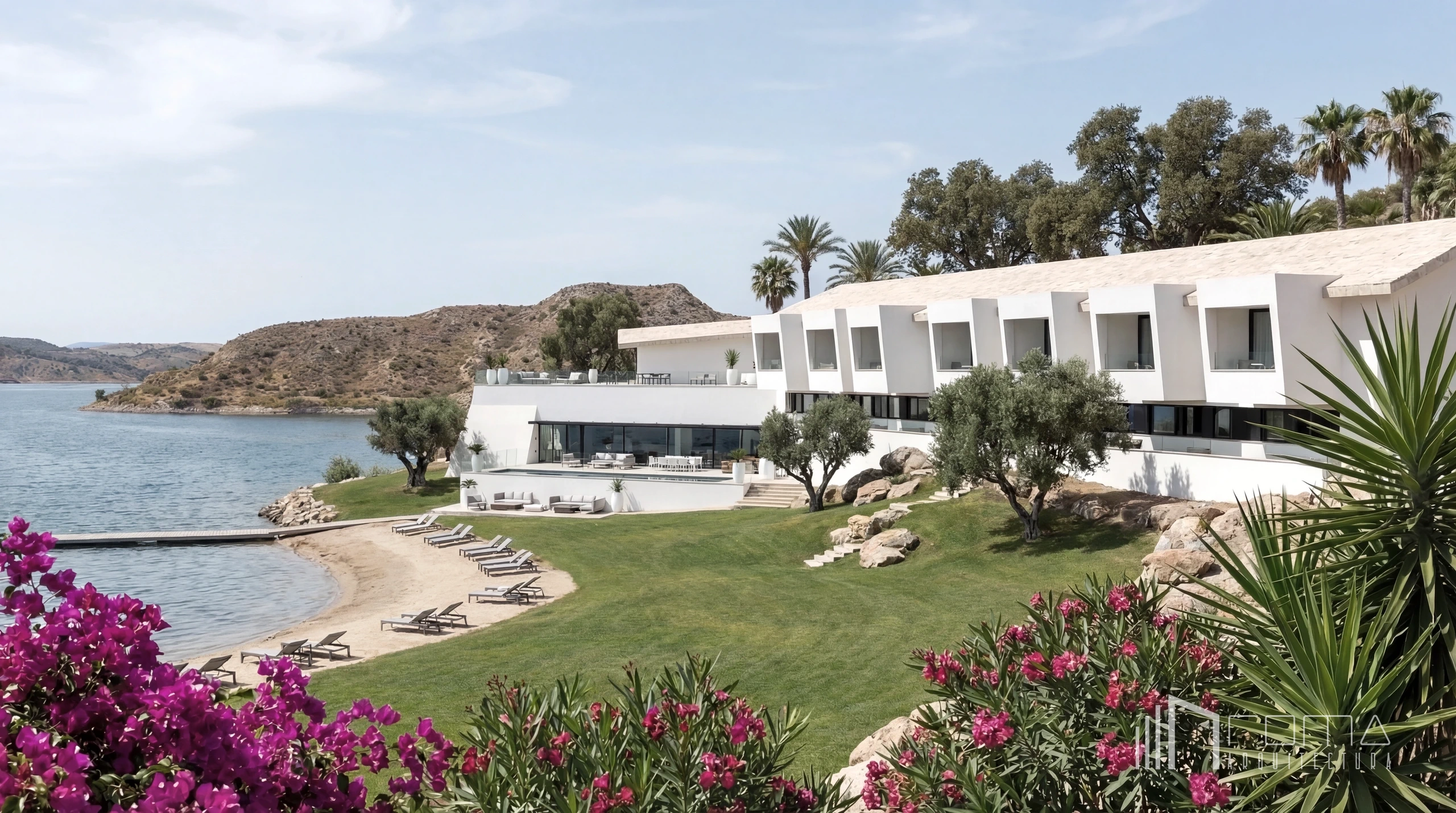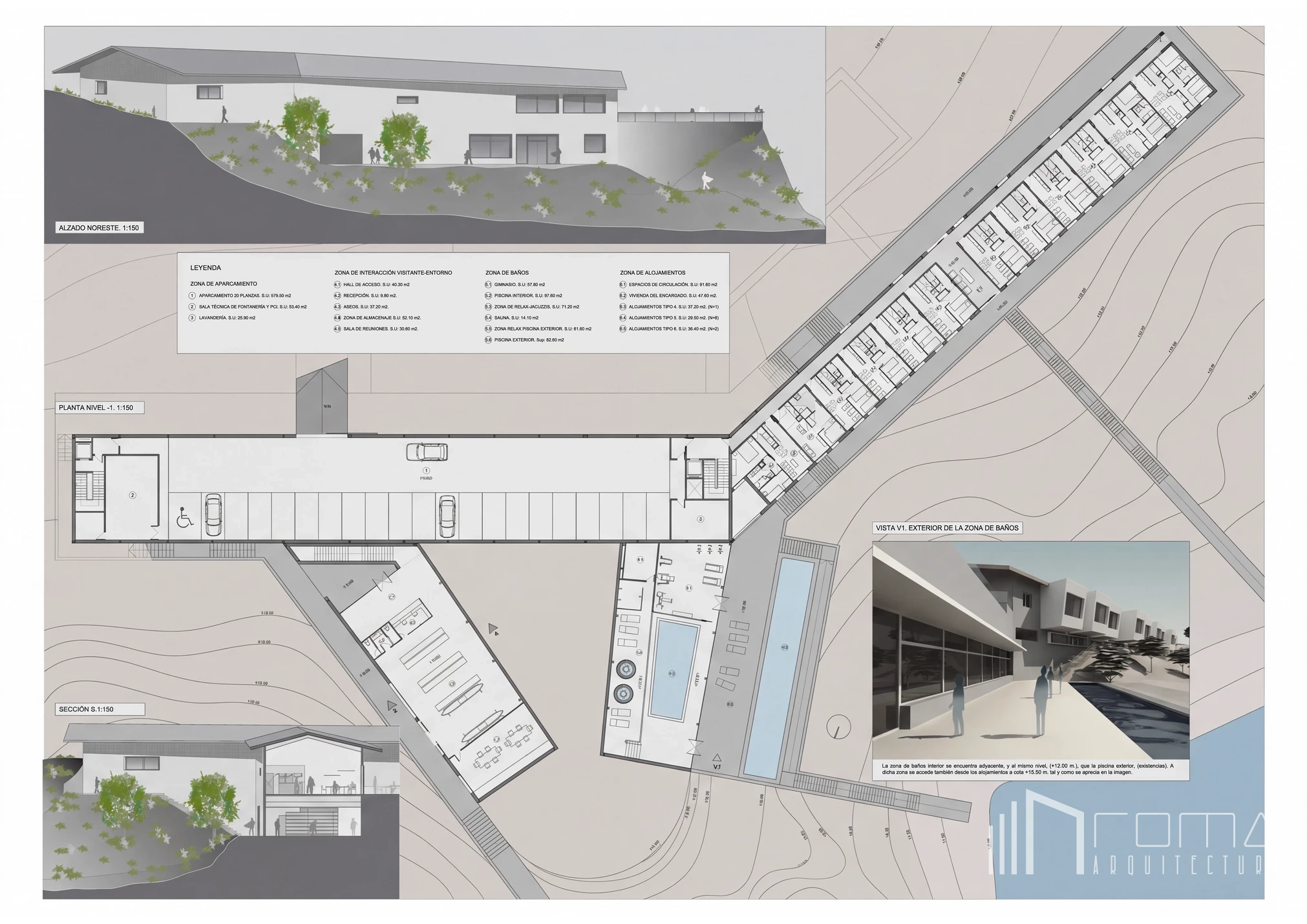 This architecture and design competition proposal for the renovation of the National Parador in Granada represents a refined vision of a sophisticated modern landmark. This exclusive building features an innovative design reimagined as an eco-friendly and peaceful retreat deeply connected to nature. The scheme showcases custom interiors with luxury, high-end finishes, integrating natural thermal pools. Every detail ensures a cohesive minimalist and contemporary aesthetic across the entire project, perfectly blending heritage with modern comfort.