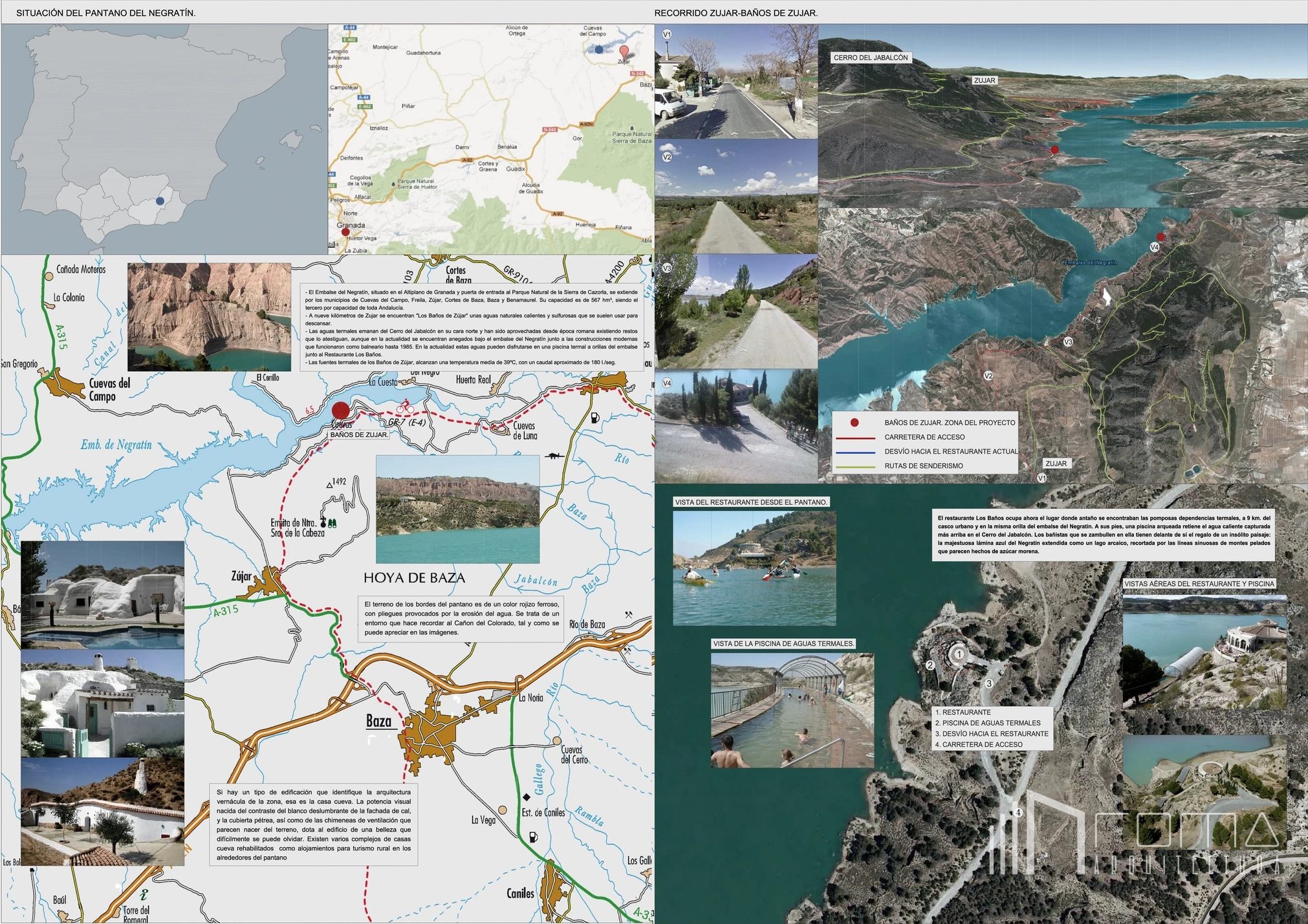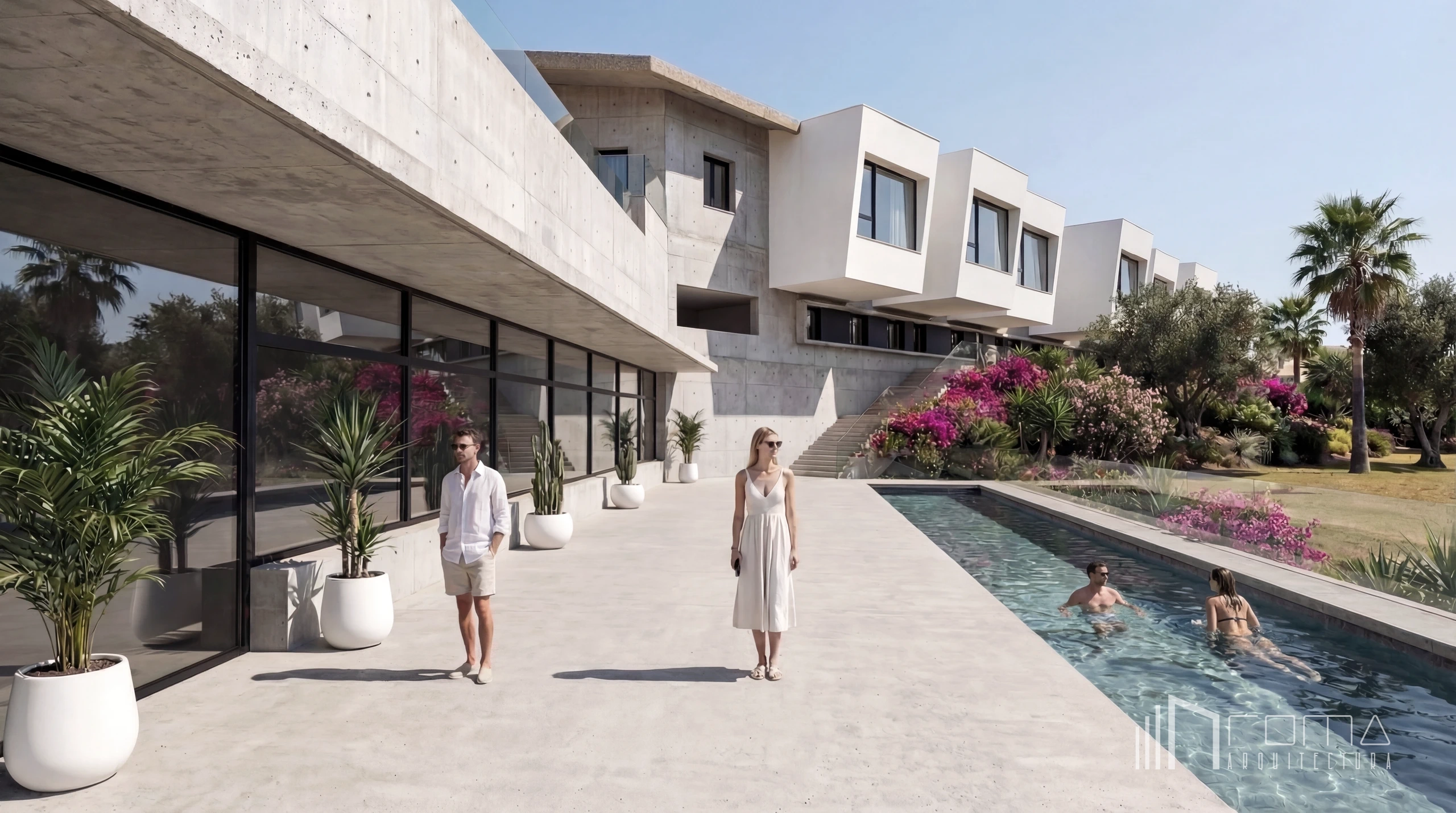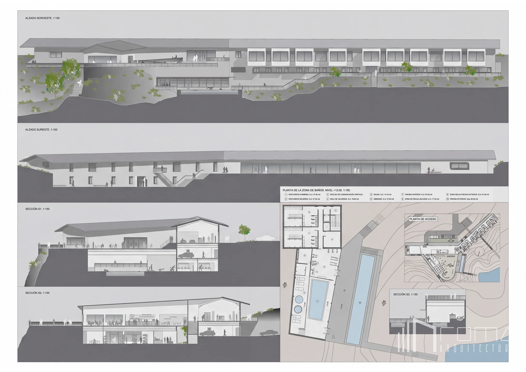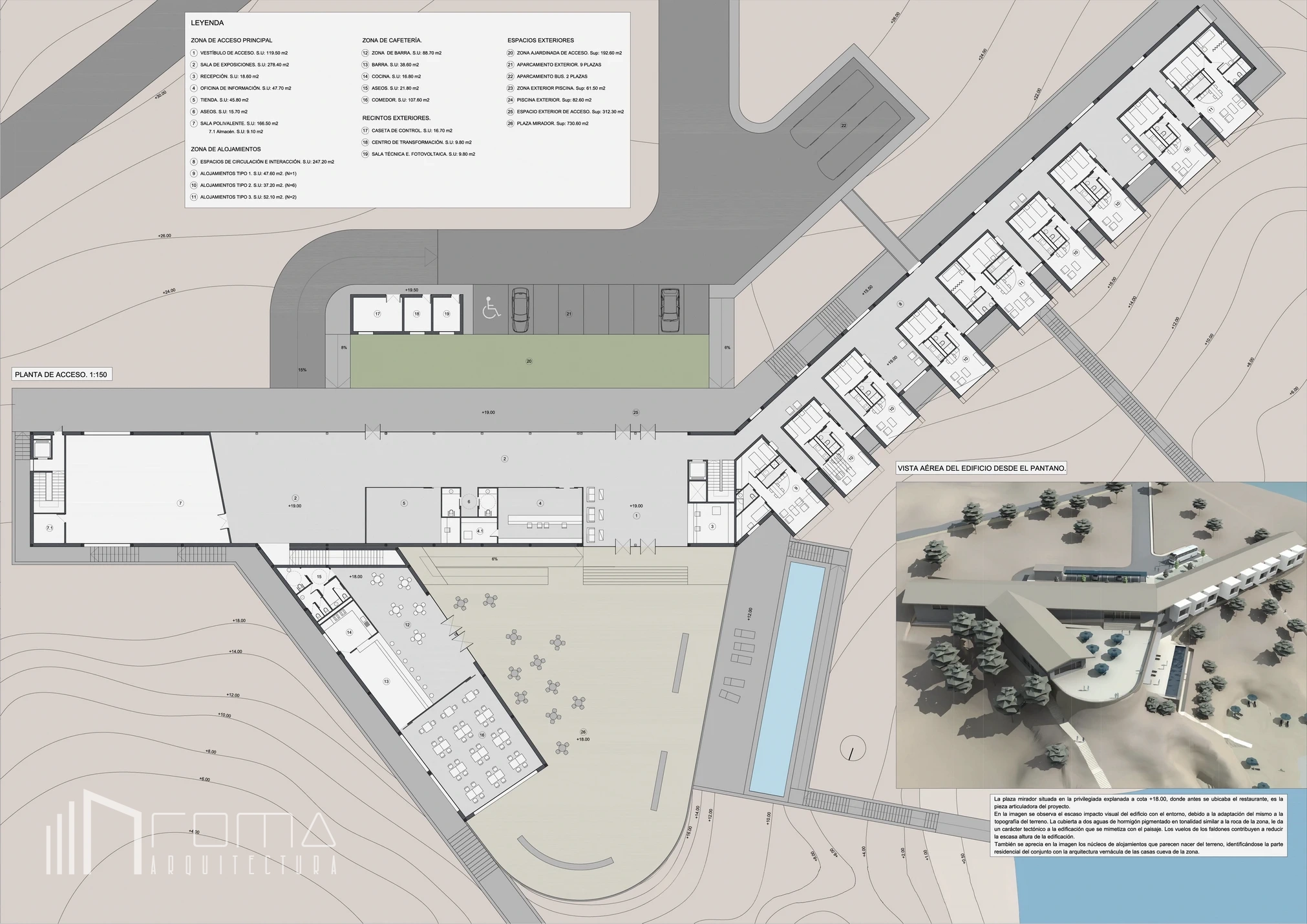 This architecture and design competition proposal for the renovation of the National Parador in Granada represents a refined vision of a sophisticated modern landmark. This exclusive building features an innovative design reimagined as an eco-friendly and peaceful retreat deeply connected to nature. The scheme showcases custom interiors with luxury, high-end finishes, integrating natural thermal pools. Every detail ensures a cohesive minimalist and contemporary aesthetic across the entire project, perfectly blending heritage with modern comfort.