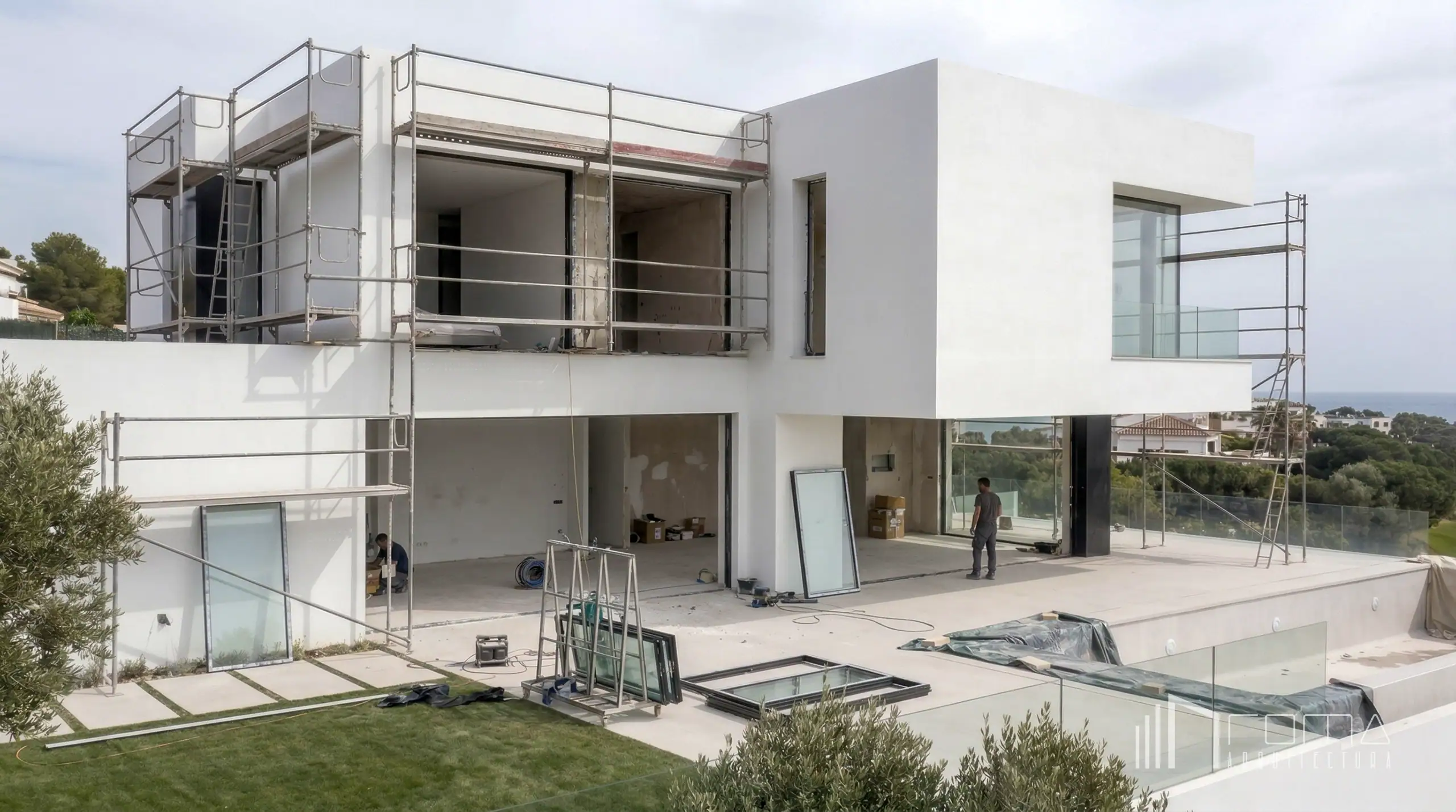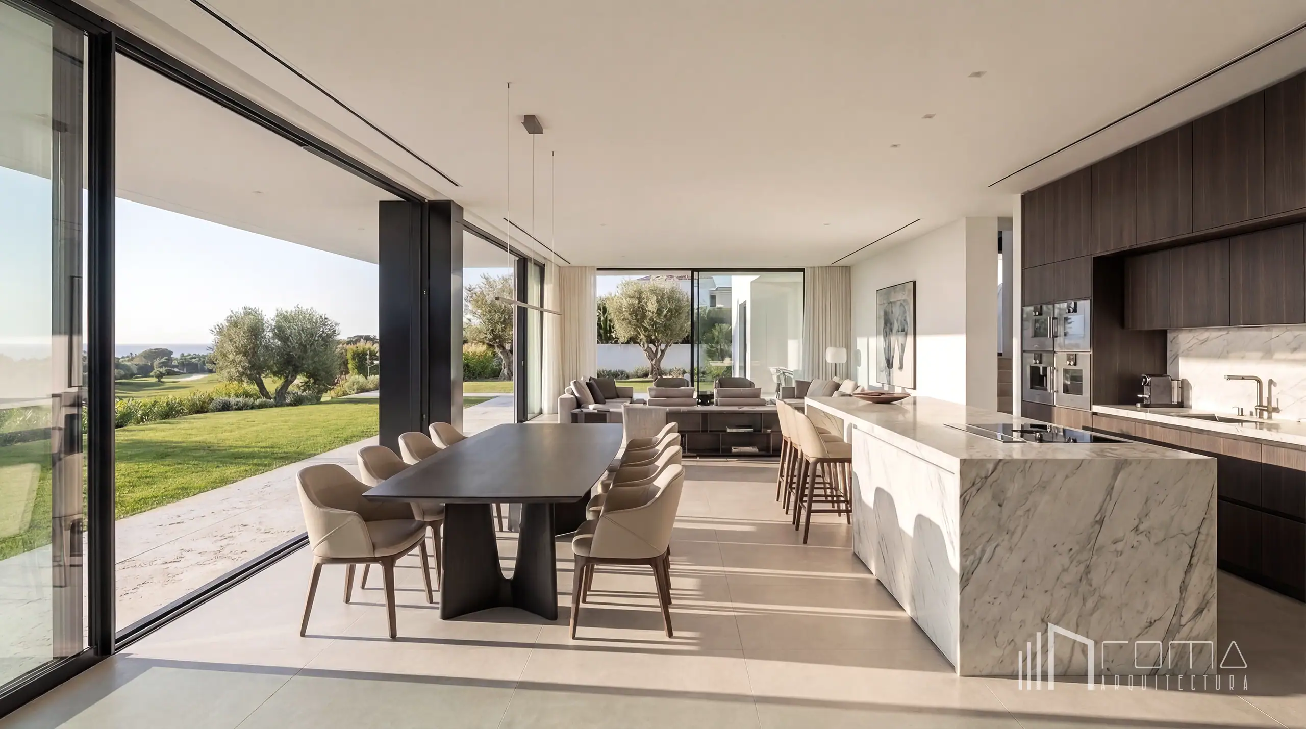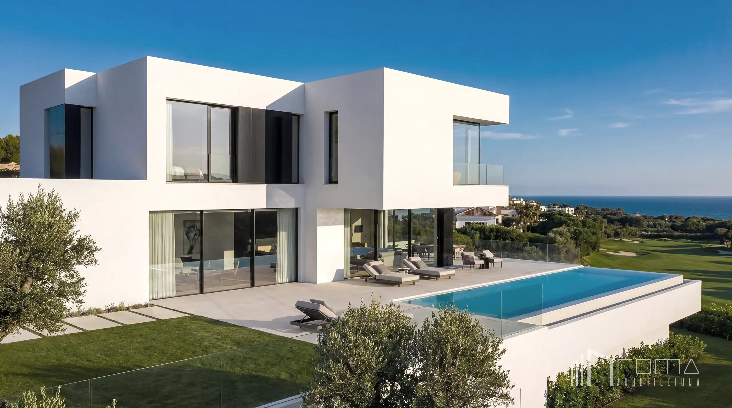 Embracing pure minimalism, the design is characterized by its white walls and floor-to-ceiling windows that dissolve the boundaries between the interior and the garden. The open-plan spaces create a seamless flow, leading toward a striking infinity pool that merges with the horizon. The project features high-end materials and innovative design solutions to create a modern dream home that meets the highest standards of sophistication and exclusive residential living on the Costa del Sol.