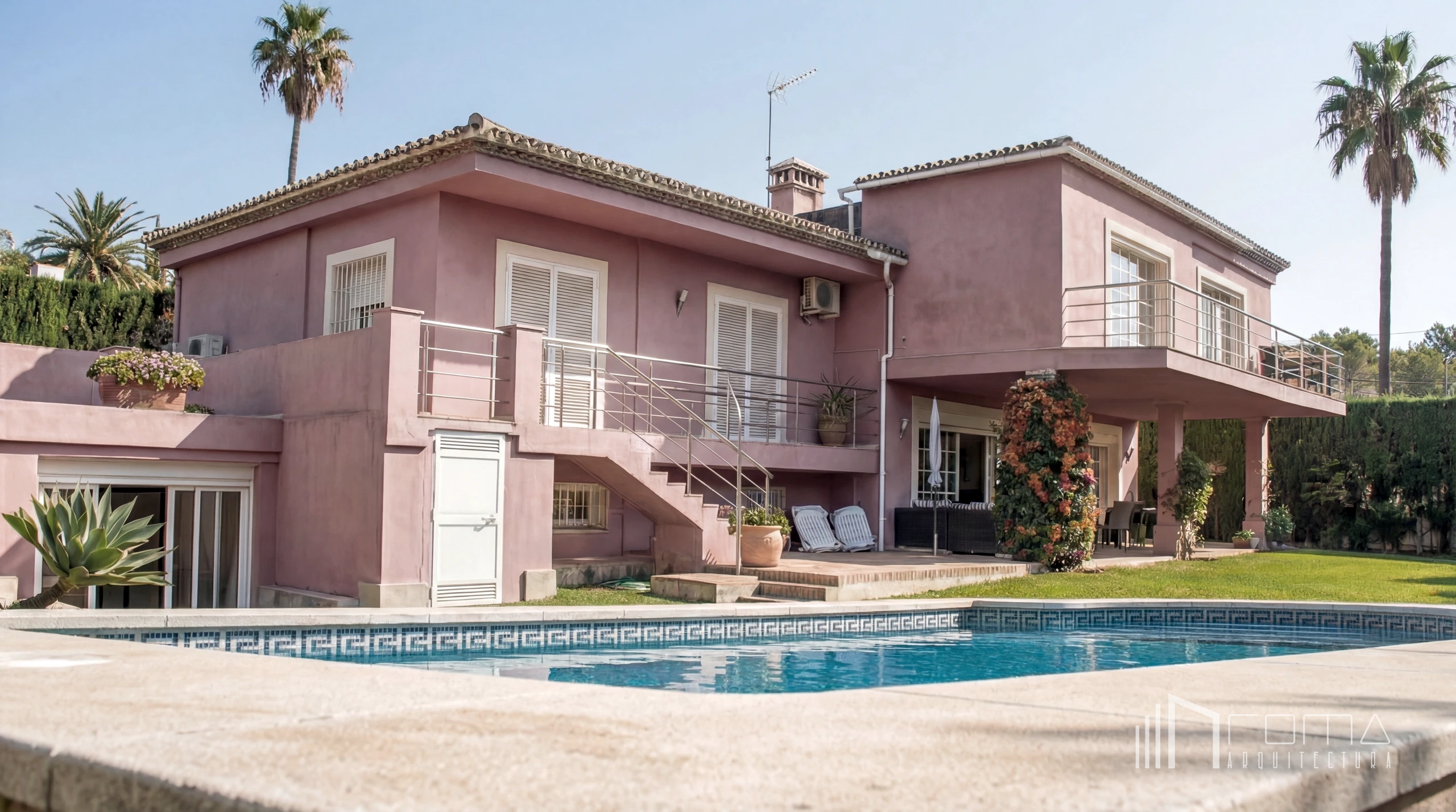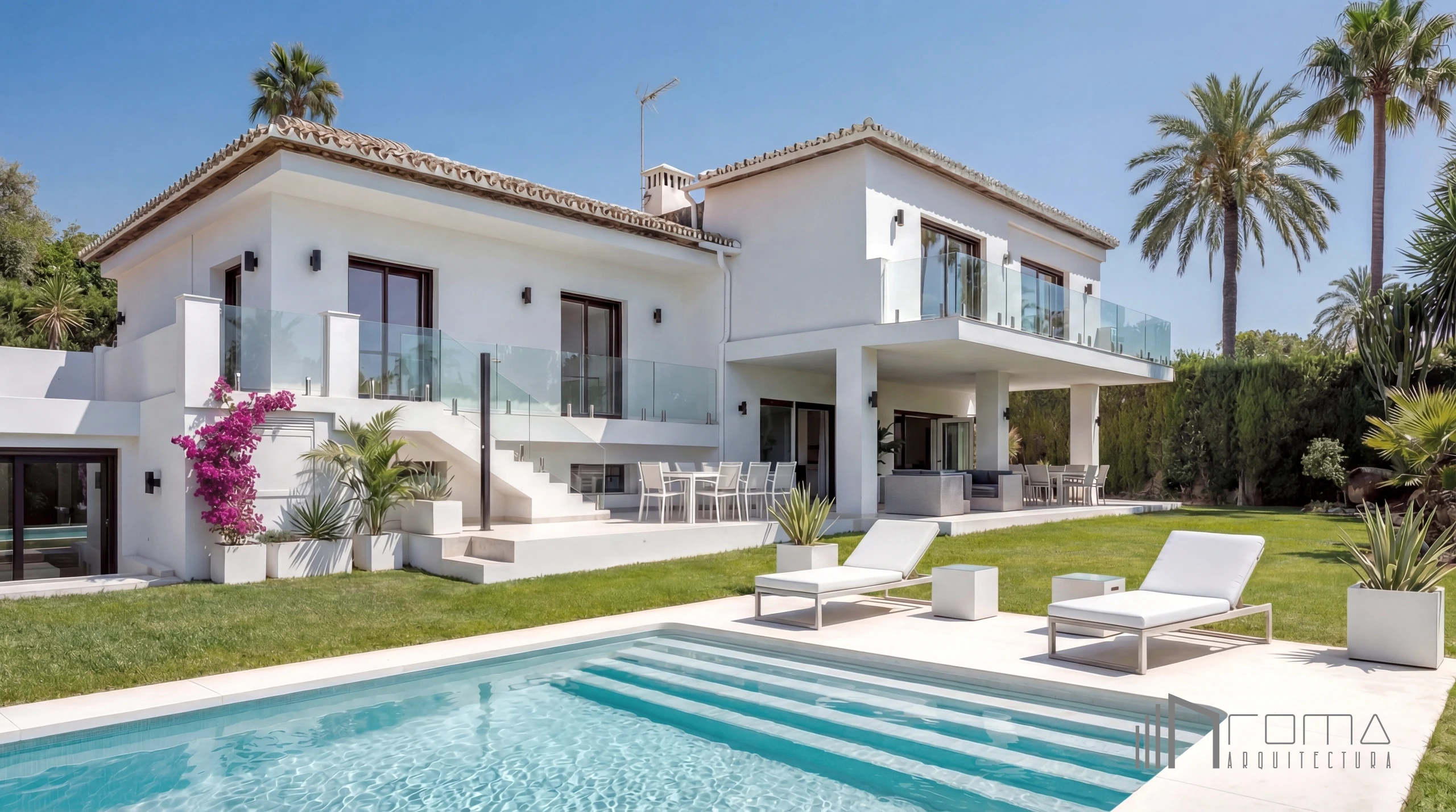 Located in Las Brisas, within the Golf Valley (Nueva Andalucia, Marbella), this villa underwent a complete transformation of both architecture and interiors. The renovation project involved replacing the outdated layout with a bespoke modern minimalist aesthetic, including a brand-new swimming pool, a custom open kitchen with high-end finishes, and a luxurious master suite. By integrating bi-fold doors, glass balustrades, and exclusive furniture, we created a seamless connection between the garden and this sophisticated dream home.