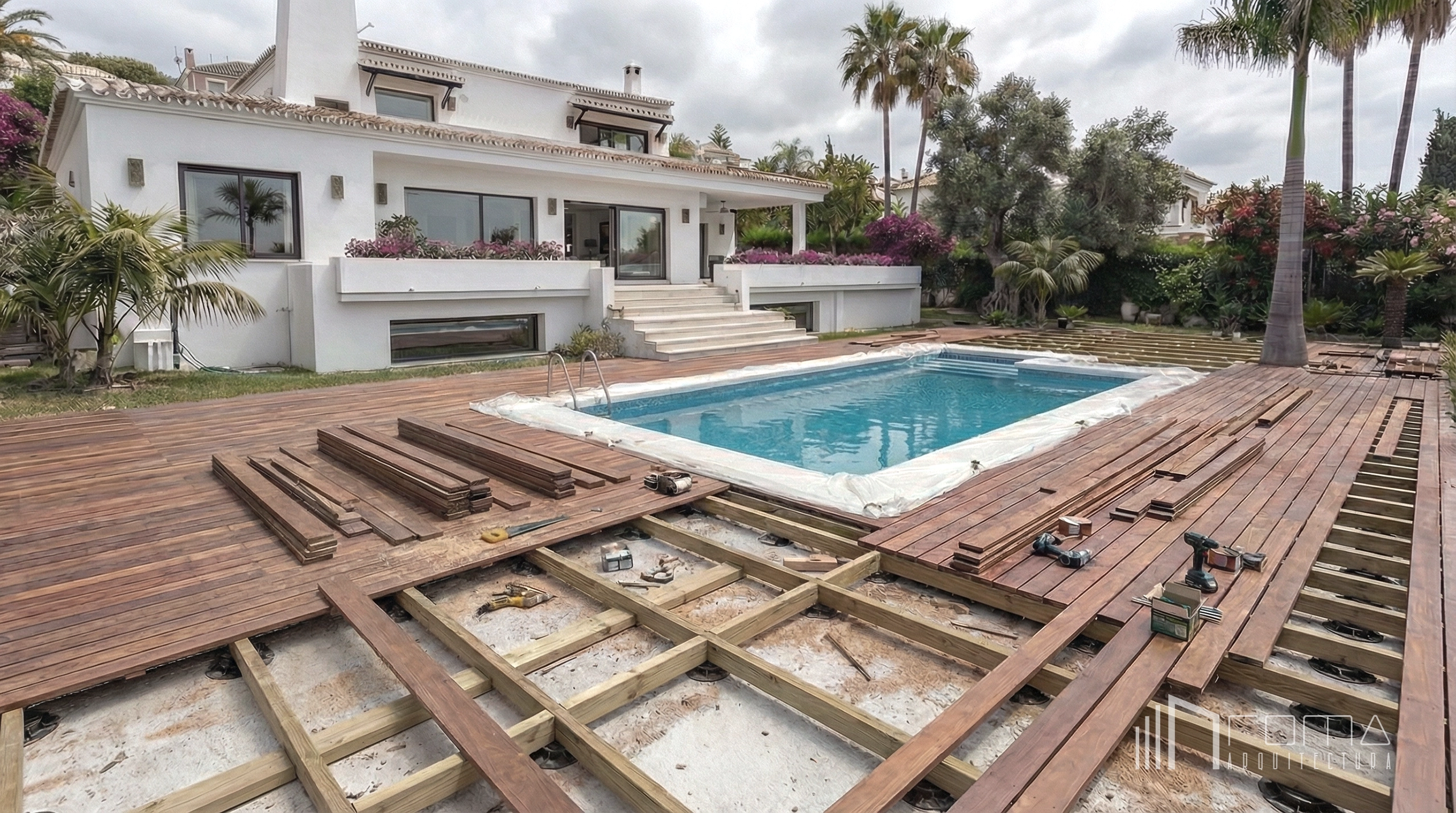 Swimming pool and decking · Work in progress