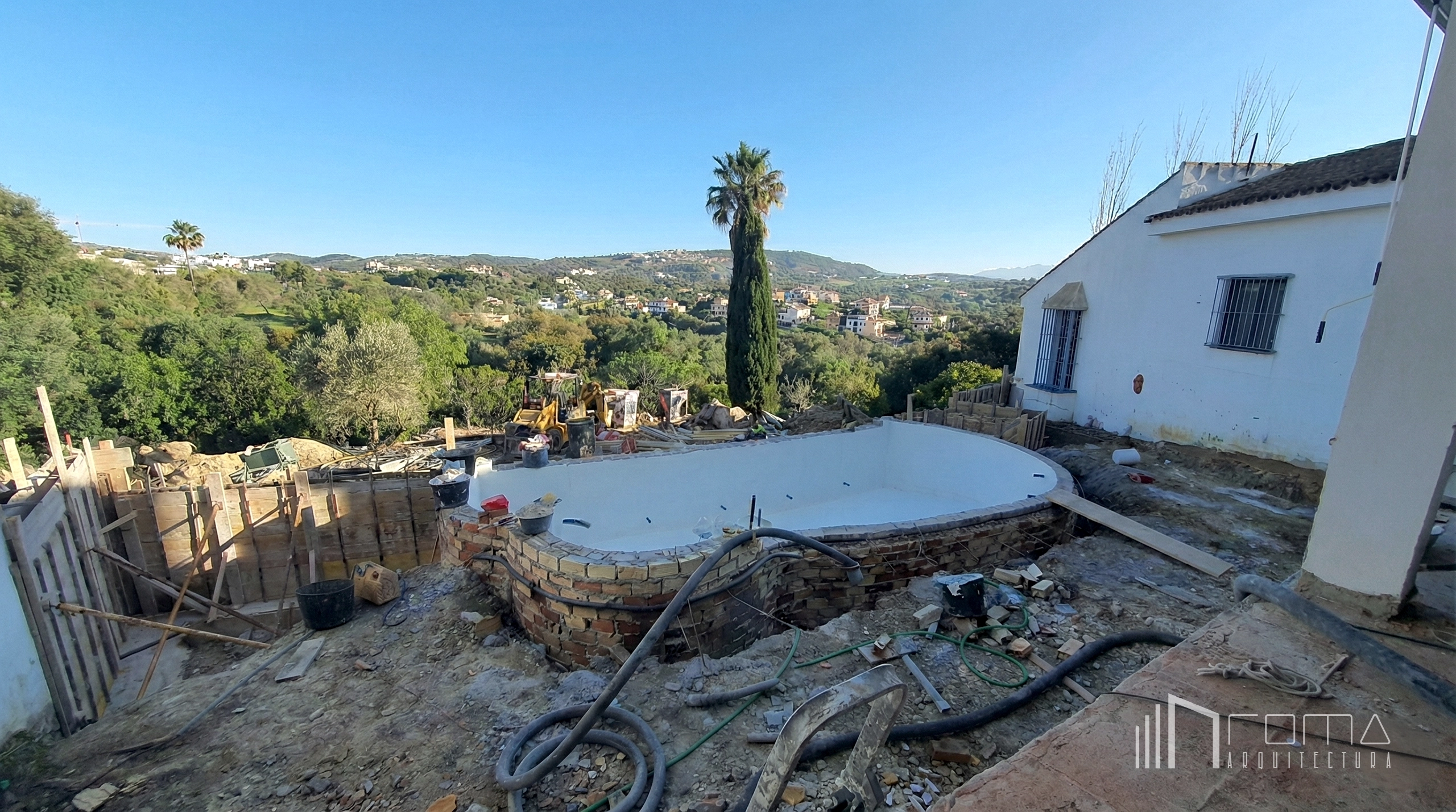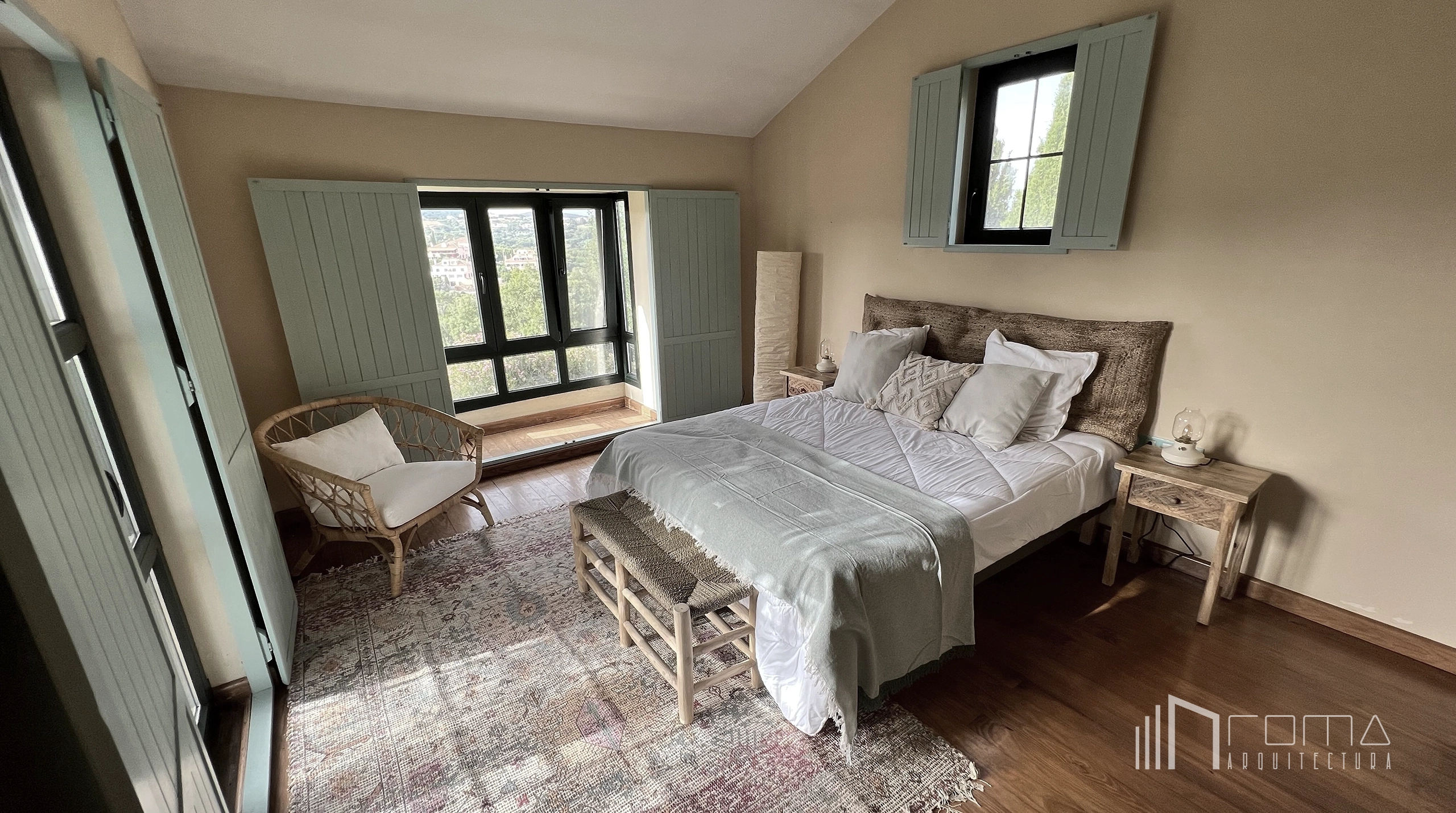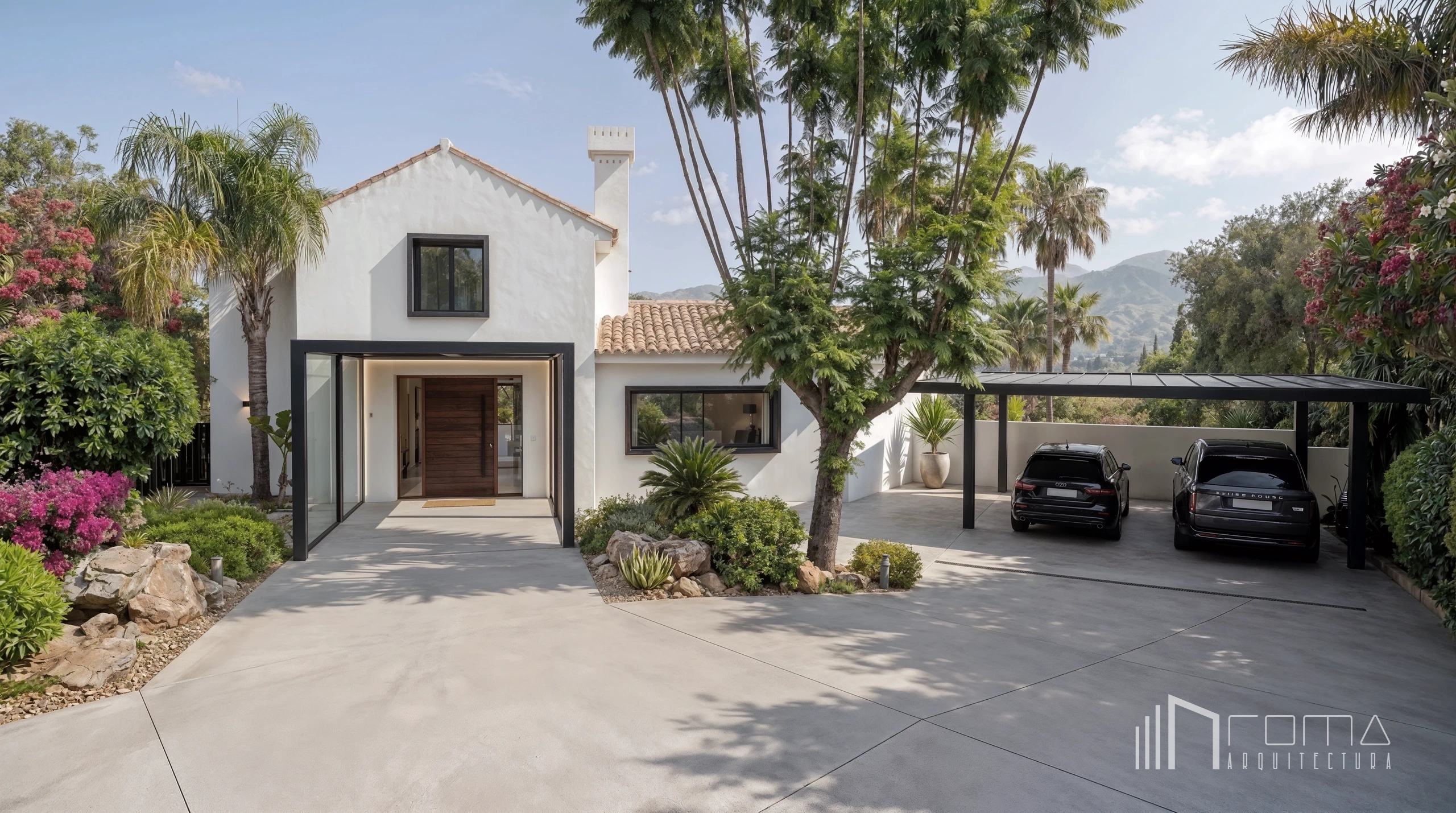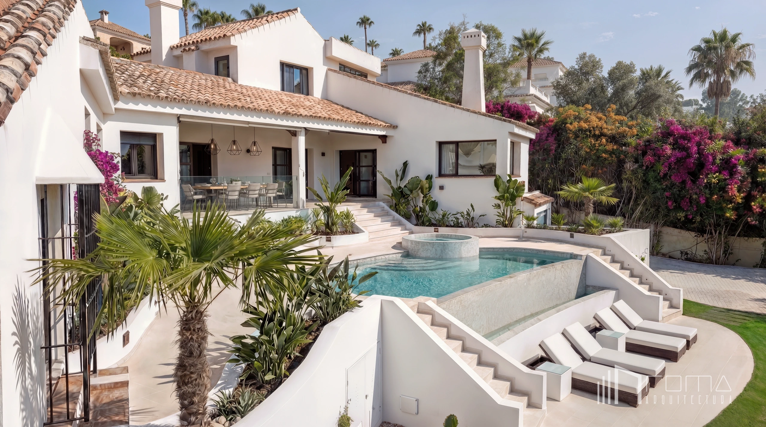 A comprehensive bespoke renovation of an old rustic villa’s architecture and interiors in Sotogrande Alto. The reform of this luxury property involved replacing an outdated kitchen and bathrooms with modern minimalist aesthetics, complemented by high-quality timber floors, exclusive furniture, and a feature fireplace. The exterior transformation was spectacular: a neglected garden has been reimagined into a tiered paradise with evergreen plants and a heated infinity swimming pool with a jacuzzi. Additionally, the front entrance was completely remodeled to enhance privacy and create a contemporary curb appeal for this dream home.